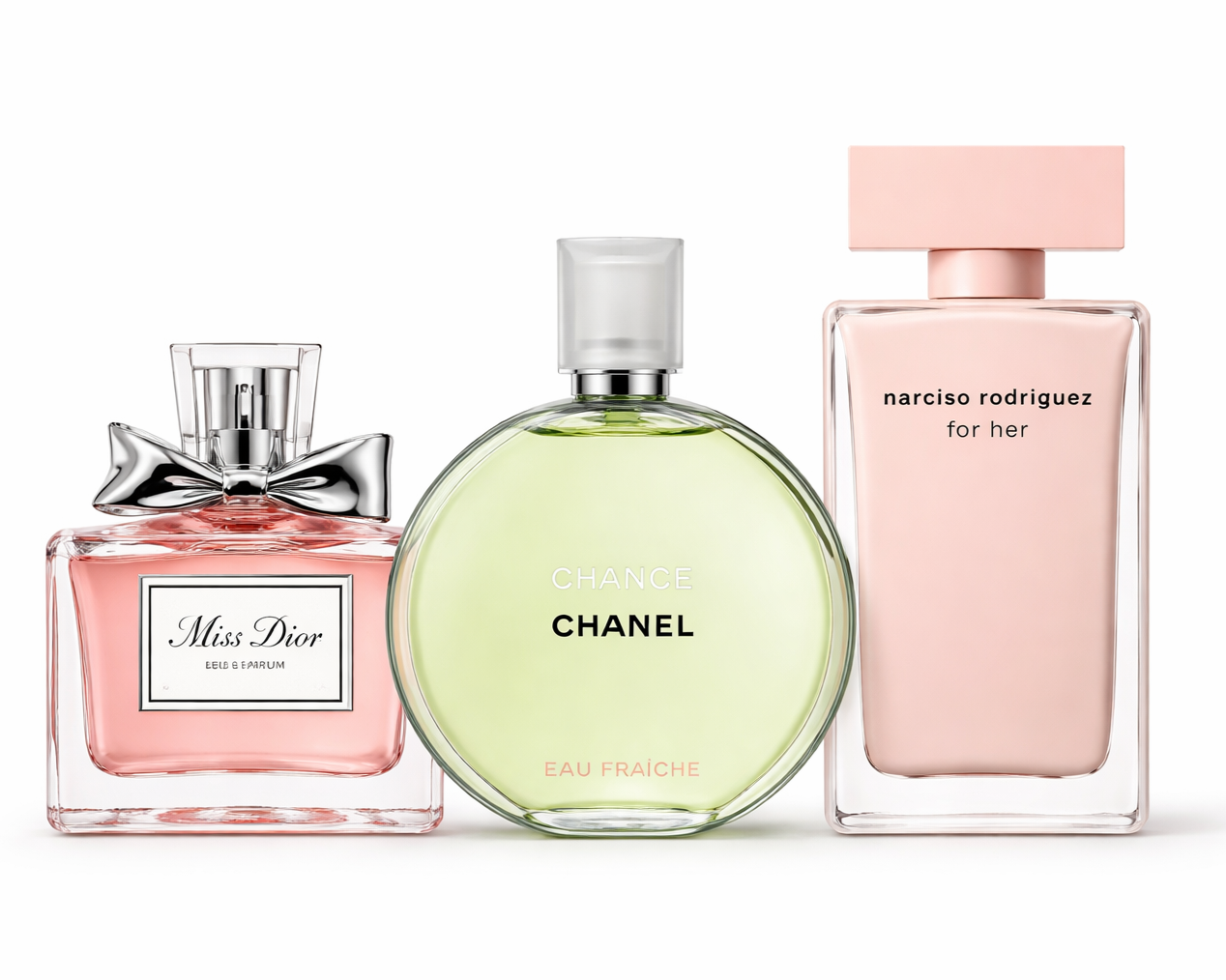 Kit Miss Dior 100ml + Chance Eau Fraîche 100ml + Narciso Rodriguez For Her 100ml – Conjunto com Três Perfumes Femininos
