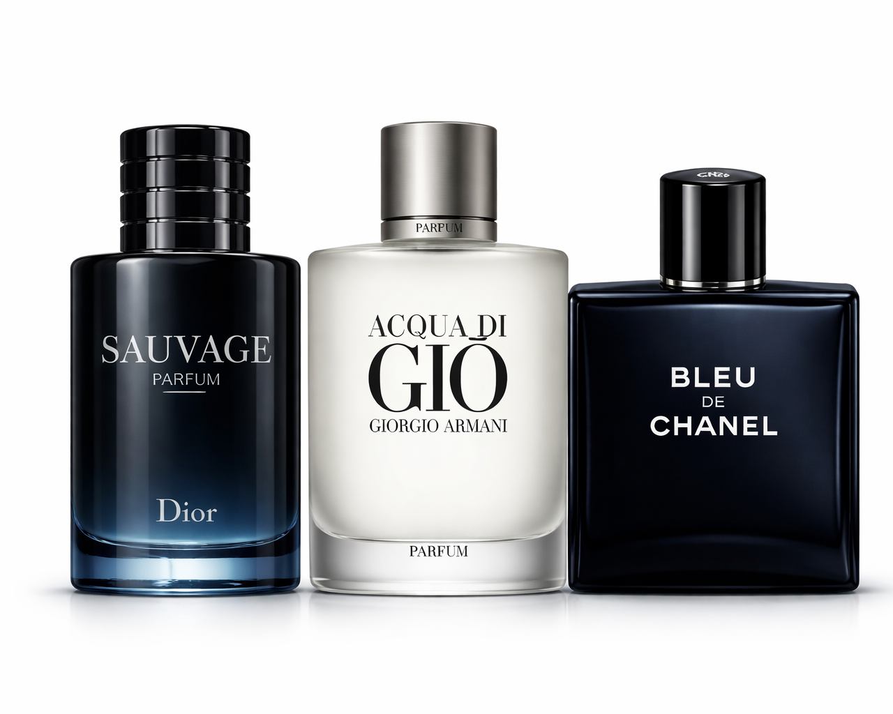 Kit Sauvage Parfum 100ml + Acqua di Giò 100ml + Bleu de Chanel 100ml – Conjunto com Três Perfumes Masculinos